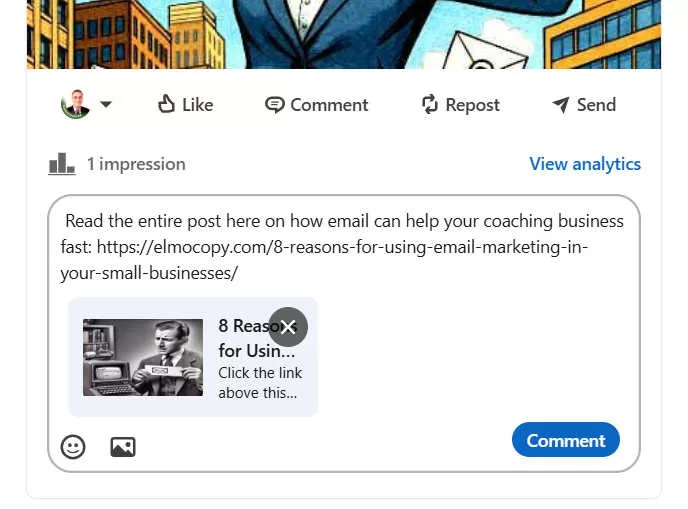 Because LinkedIn doesn’t like sending people off its platform. If you stick a link in the body of your post, the algorithm buries it. But if you post your link in the first comment—say, to your website—it gets the visibility without the penalty.